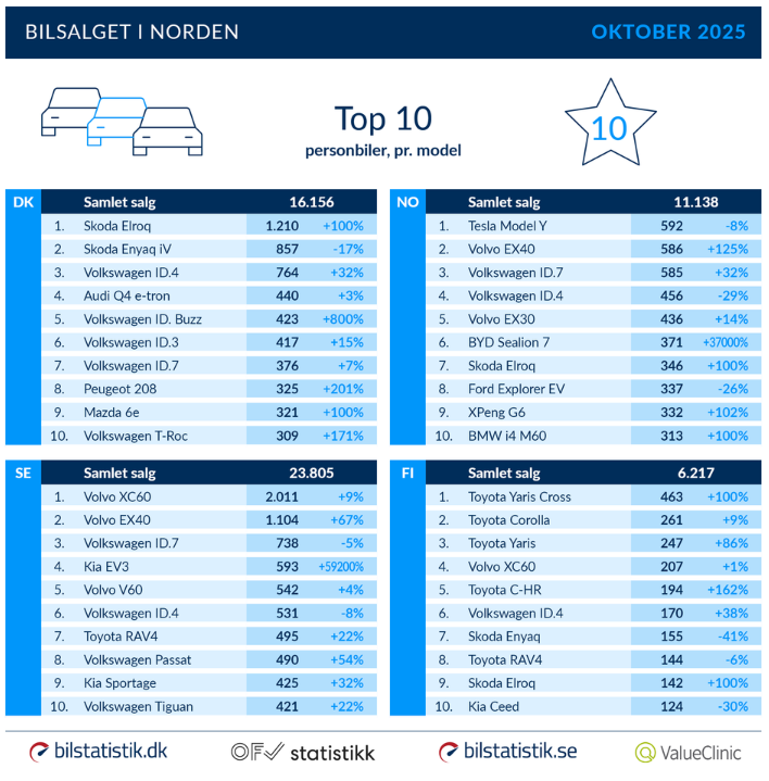 Dermed lægger Danmark sig i front i det skandinaviske bilsalg i oktober, der generelt var præget af stabilitet.